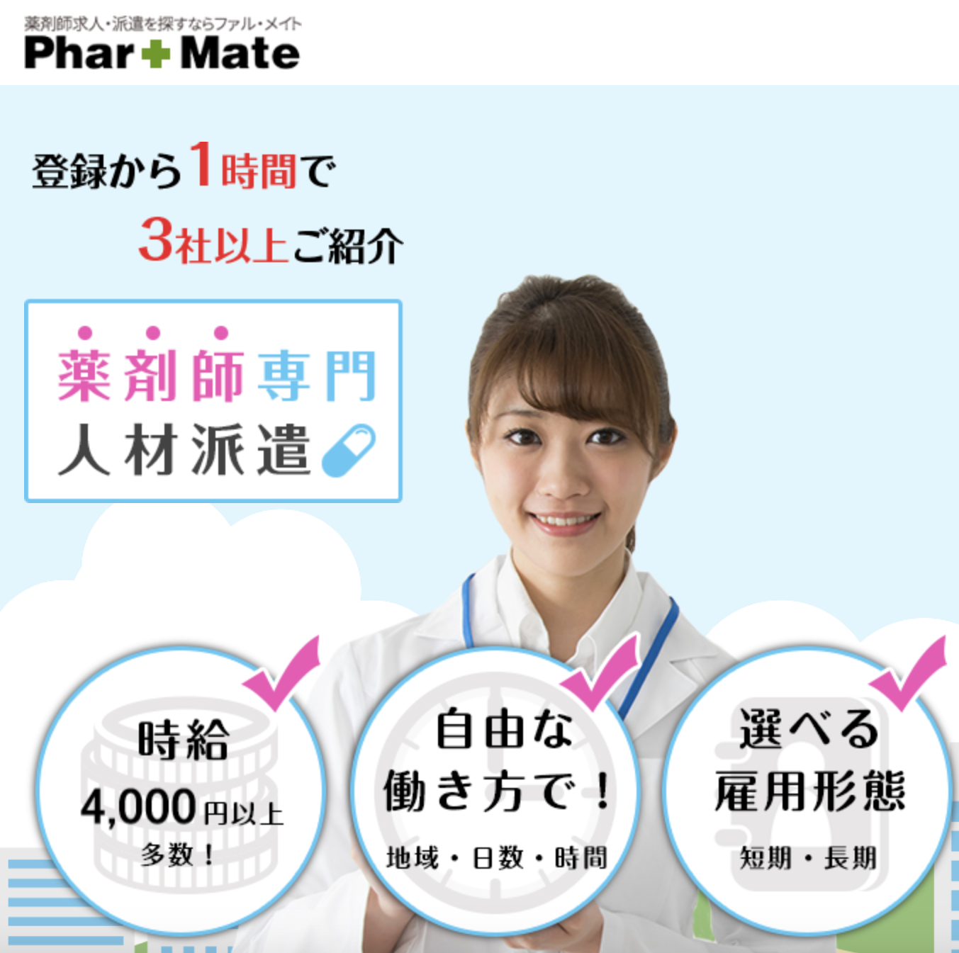 薬剤師専門の派遣・人材紹介サービスで、 関東・関西を中心に日本全国豊富な求人情報を提供し、 派遣であれば、関東2800円 関西2700円を最低保障してくれます。